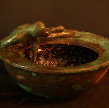 Tilted askew on a bowl upset by the force of impact, this figure stares down at the fire in his chest. Oil draws from a hidden inner wall of the bowl; bowl is food-safe.